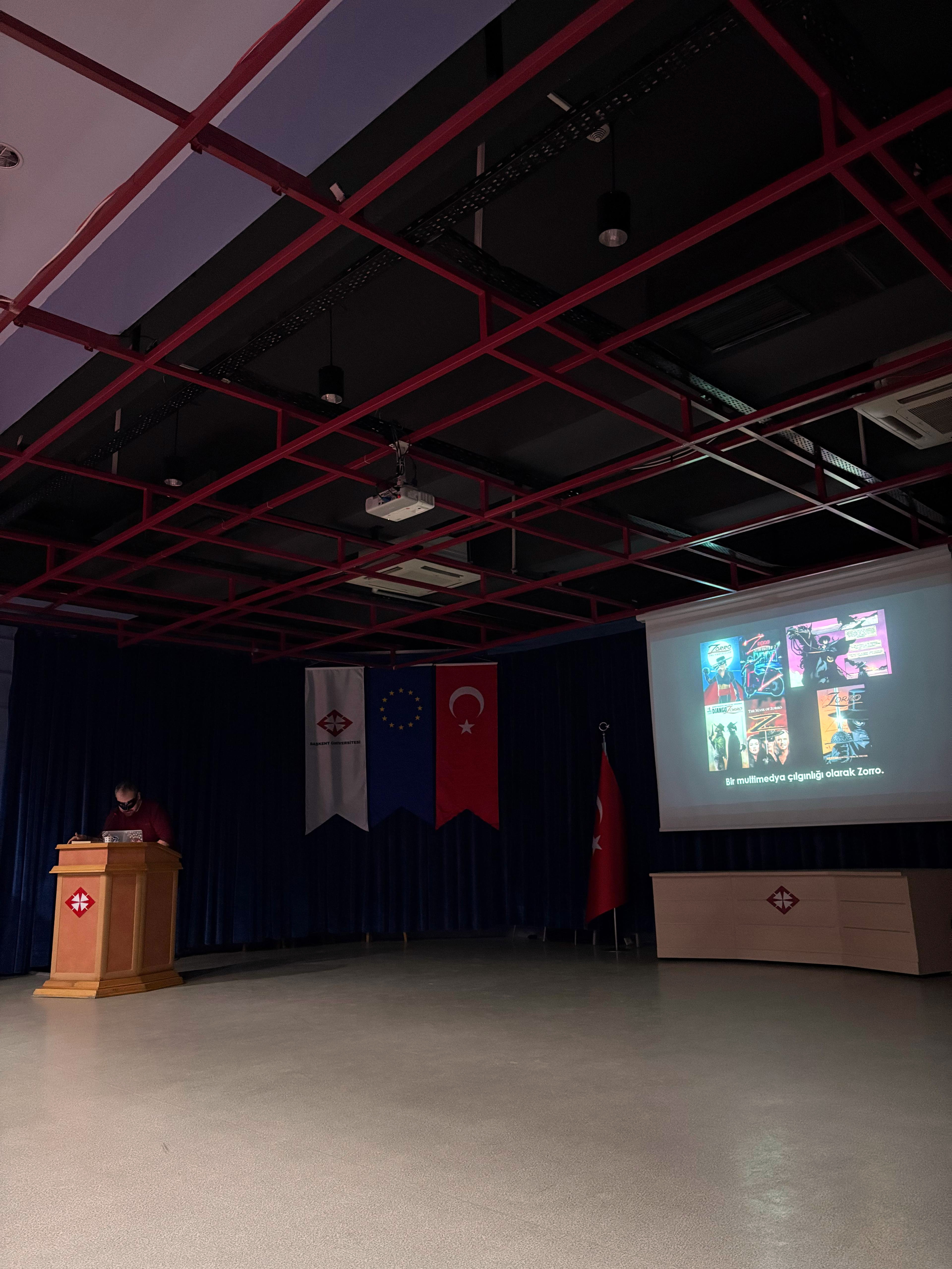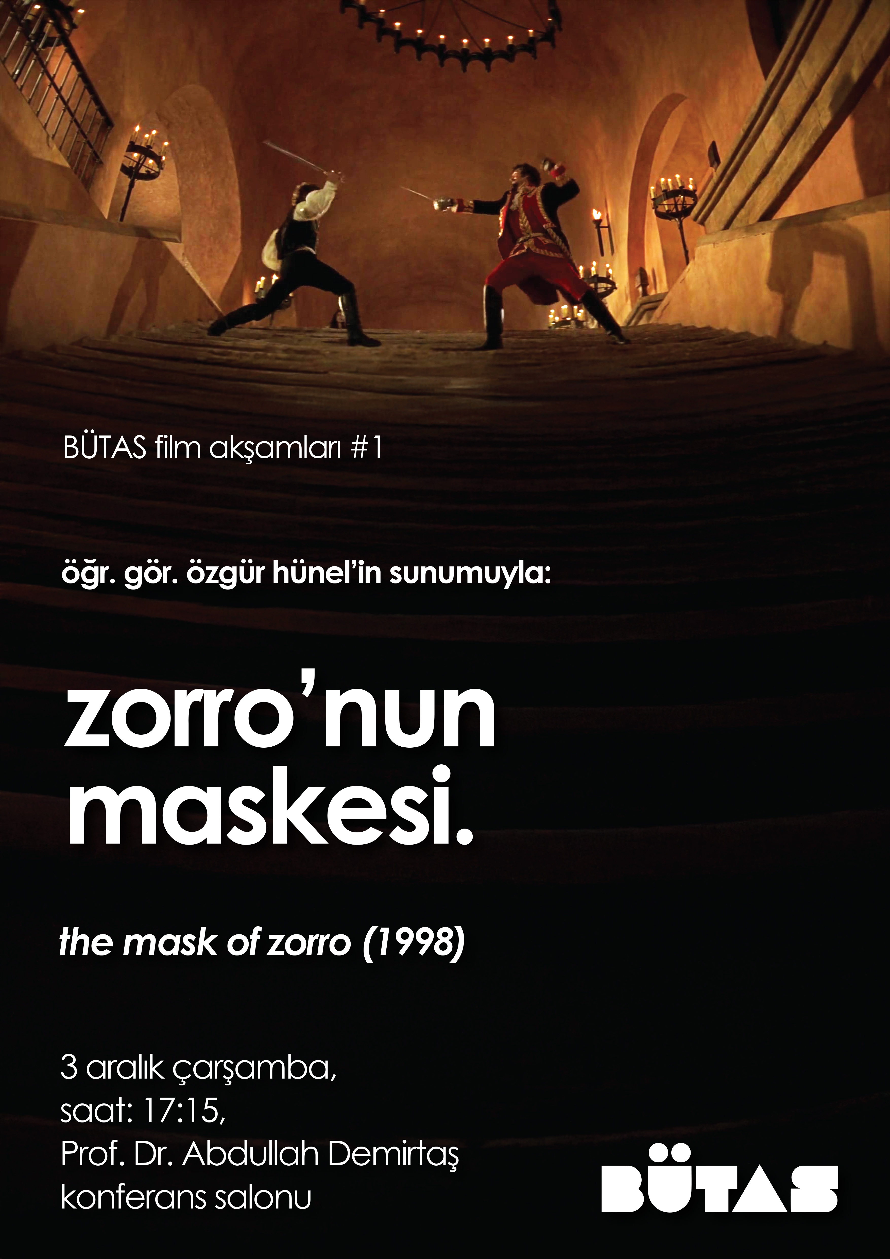 Öğrenci topluluğumuz BÜTAS, "Film Akşamları" etkinlik serisinin ilkini, 1998 yapımı "The Mask of Zorro" filmiyle gerçekleştirdi. Etkinlik, bölümümüz Öğretim Görevlisi Özgür Hünel'in edebiyat ve sinemada süper kahramanların evrimi ve bu süreçte Zorro karakterinin önemine değindiği sunumla başladı.